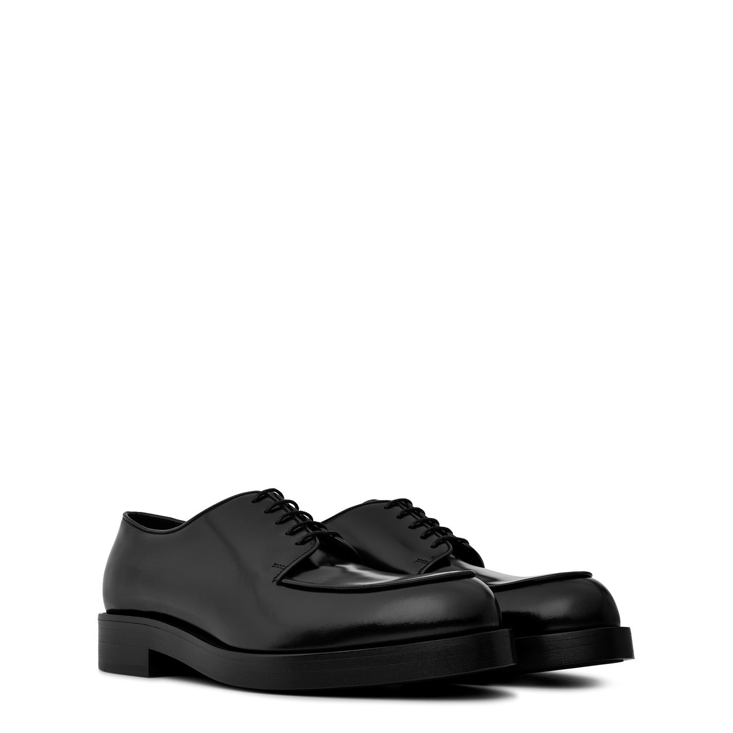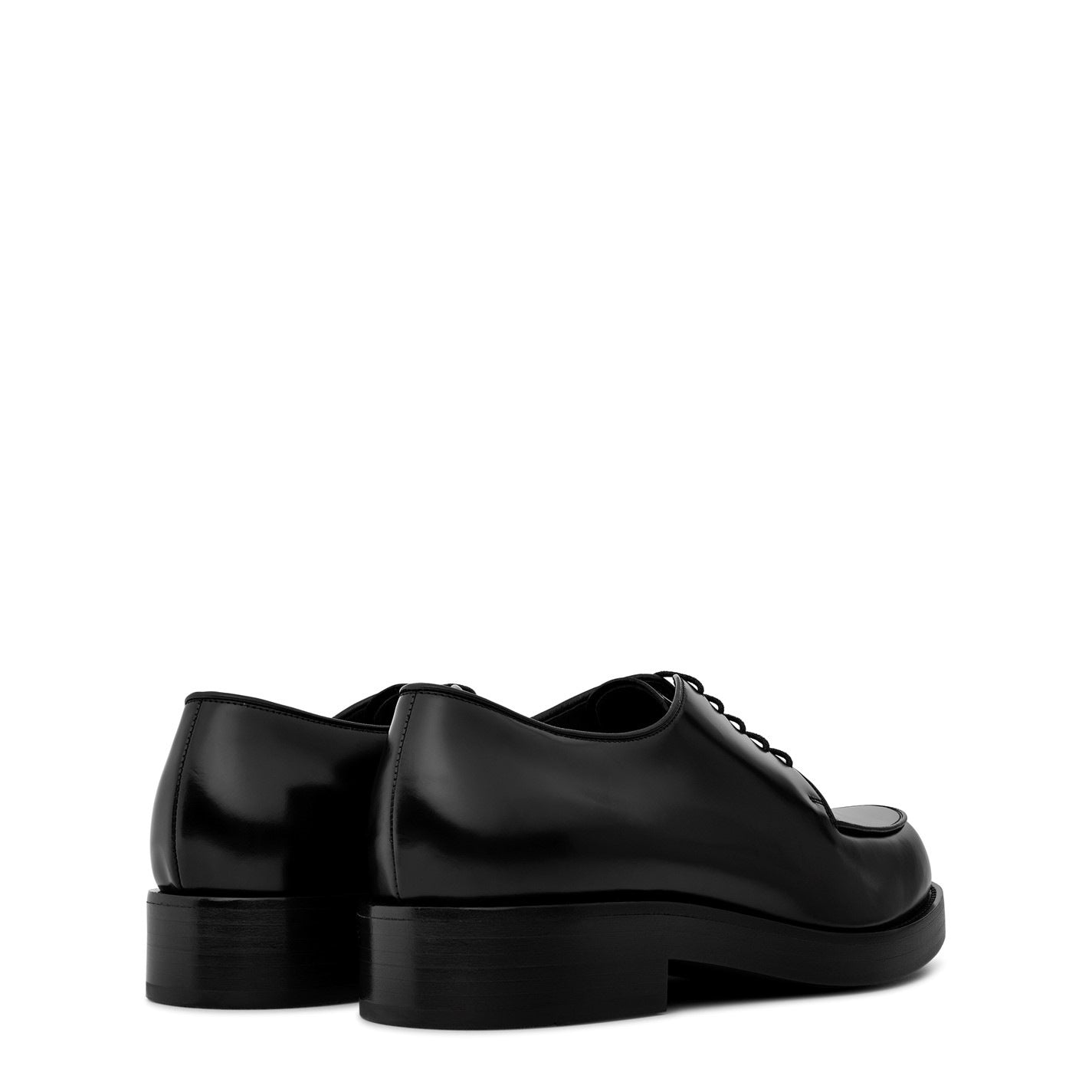 The Prada Lace Derby showcases timeless elegance with a modern edge. This sleek black leather shoe features a polished finish that exudes sophistication and versatility. The distinctive square toe adds a contemporary twist to the classic derby silhouette, setting it apart from traditional designs. Crafted with meticulous attention to detail, these shoes boast durable leather construction and a robust lace-up closure for a secure fit. The chunky, low-profile sole not only provides excellent traction but also adds a subtle height boost and a fashion-forward look. Perfect for both formal occasions and elevated casual wear, the Prada Lace Derby offers unparalleled comfort with its cushioned insole and quality craftsmanship. The shoe's streamlined design ensures it pairs effortlessly with suits, dress pants, or even dark denim for a smart-casual ensemble. Ideal for the discerning gentleman who values both style and substance, these Prada derbies are an investment piece that will elevate any wardrobe. Whether you're heading to the office, attending a special event, or enjoying a night out, these shoes will keep you looking polished and feeling confident all day long.
