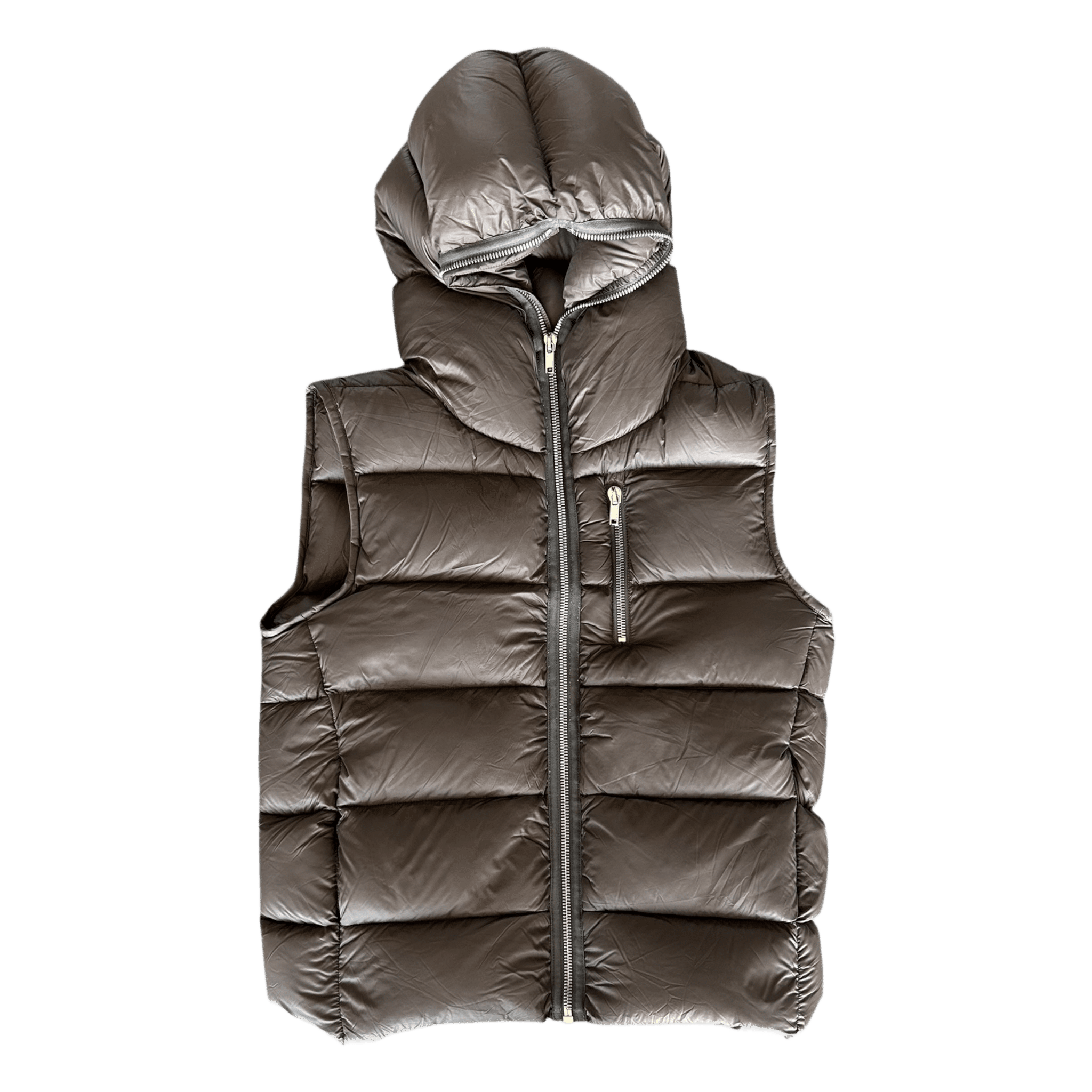 PRODUCT: Rick Owens Brown Gimp Hooded Puffer Vest