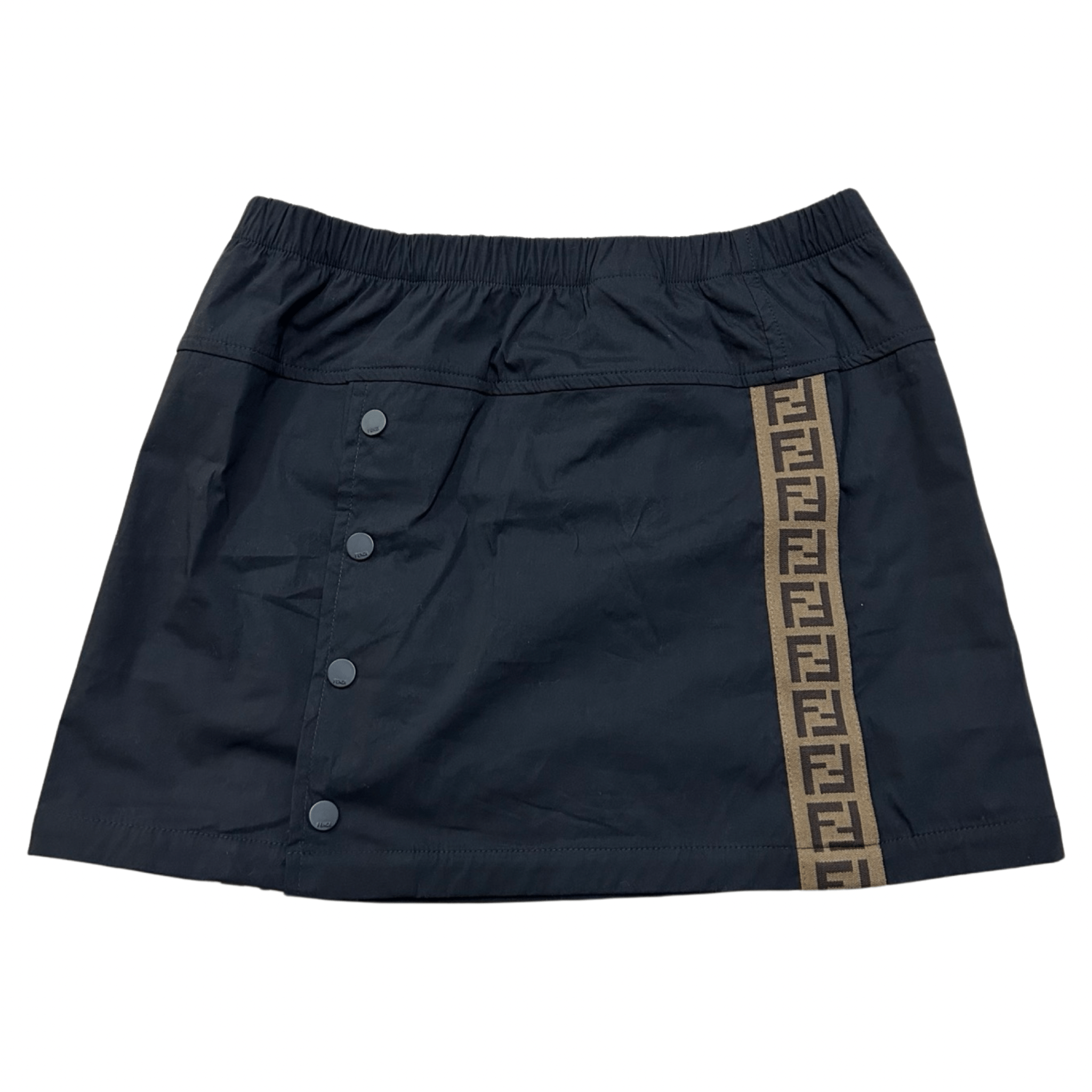 Indulge in sophistication with the Fendi Junior Tape Skirt in Black. Featuring an elasticated waist and three branded poppers on the front, this skirt is adorned with the iconic brown Fendi branding on the sides. Crafted from a luxe blend of cotton, polyamide, and elastane, it is both comfortable and chic. Keep it looking pristine with easy machine washing.