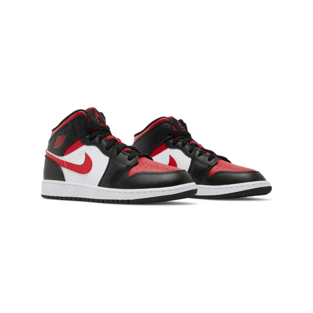 Introducing the Air Jordan 1 Mid GS Bred Toe White, featuring the iconic black toe cap with a red toe box and white mid-panels. Complete with red Swooshes and a bright red Jumpman on the tongue, this design is elegant and exclusive.