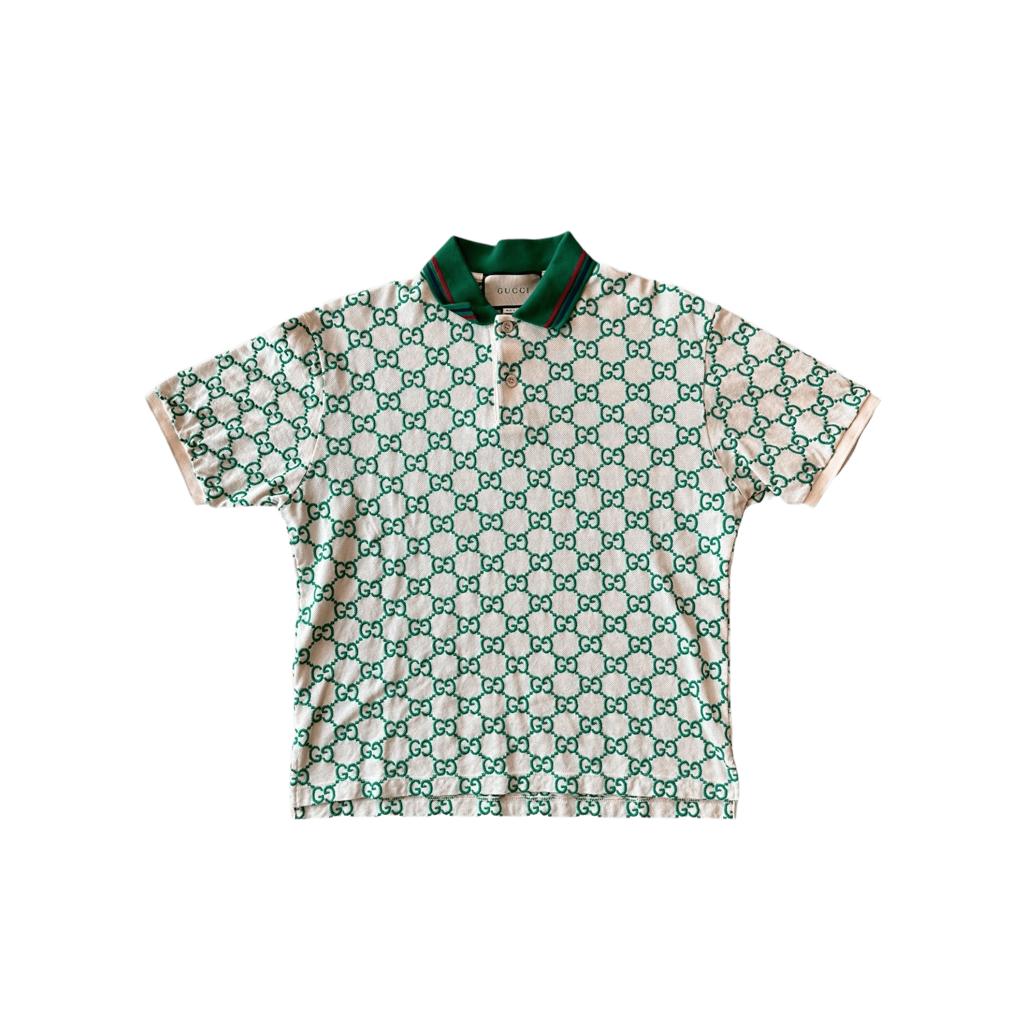 White color Green Gucci GG monogram Two buttons under collar Striped collar Missing sizetag and washtags
